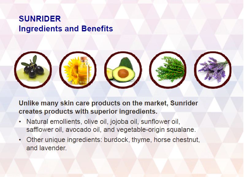 Skincare products are also based on Philosophy of Regenaration. Nowdays, lot of skincare contains lanolin oil (derived from the grease of sheep hair), ozokerite wax (derived from coal and shale), microcrystalline wax (derived from petroleum) but Sunrider uses naturally derived ingrediences, just to name a few to get the best: eg. avocado oil, click here ...